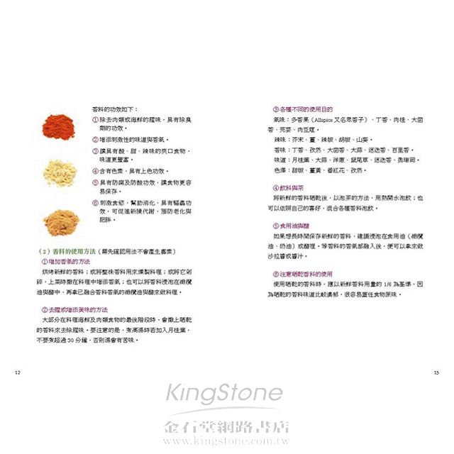 一、將過去我國所謂的醃汁及調味料中最普遍使用的香料,加以整理分類,讓讀者一目了然。每當提到香料,人們總會聯想到西方國家,其實我國也有很好且不亞於西方的香料,讀者透過本書便可以確認此事。