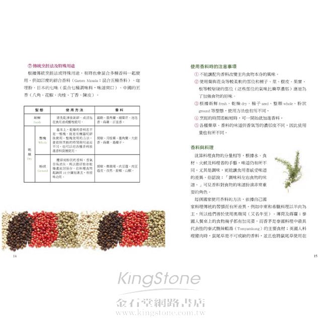 二、逐一介紹在從事料理的經驗中所獲得的香料資訊。由於過去所接觸的香料資訊都屬學術性,因此本書將以更生活化的方式來介紹香料,根據香料類別分為味道與香氣、功效與用途、食用部位及保存方法等。我想這樣的分類法,無論你是專業還是業餘的,都可以輕鬆地認識香料。