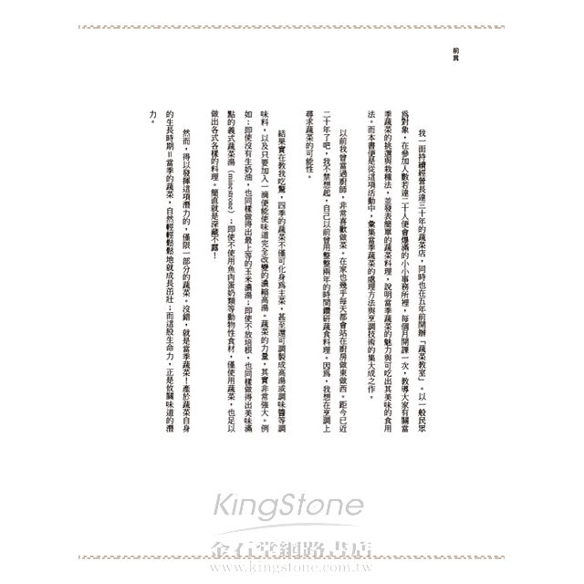 我一面持續經營長達三十年的蔬菜店,同時也在五年前開辦「蔬菜教室」。以一般民眾為對象,在參加人數若達二十人便會爆滿的小小事務所裡,每個月開課一次,教導大家有關當季蔬菜的挑選與栽種法,並發表簡單的蔬菜料理,說明當季蔬菜的魅力與可吃出其美味的食用法。而本書便是從這項活動中,彙集當季蔬菜的處理方法與烹調技術的集大成之作。