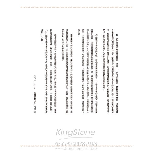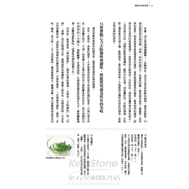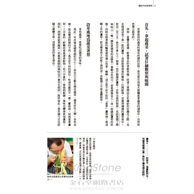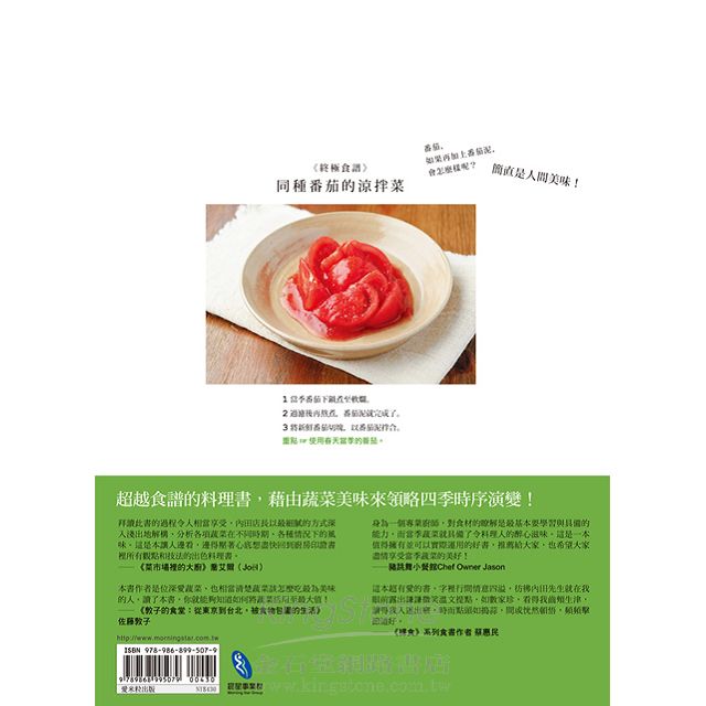 拜讀此書的過程令人相當享受,內田店長以最細膩的方式深入淺出地解構、分析各項蔬菜在不同時期、各種情況下的風味。這是本讓人邊看,邊得壓著心底想盡快回到廚房印證書裡所有觀點和技法的出色料理書。──《菜市場裡的大廚》喬艾爾(Joël)