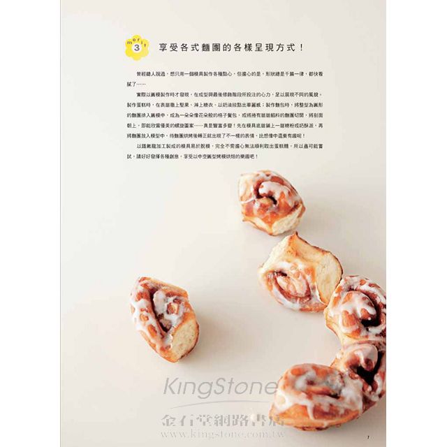 實際製作時才發現,在塑型與最後修飾階段所投注的心力,就足以展現不同的風貌。製作蛋糕時,在表層撒上堅果、淋上糖衣、以奶油妝點出華麗感;製作麵包時,將整型為圓形的麵團排入圓模中,成為一朵朵像花朵般的格子餐包、或將捲有層層餡料的麵團切開,將剖面朝上,即能欣賞優美的螺旋圖案...等等造型,真是豐富多變!先在模具底層鋪上一層糖粉或奶酥派,再將麵團放入模型中,待麵團烘烤後轉正就出現了不一樣的表情,比想像中還要有呢!