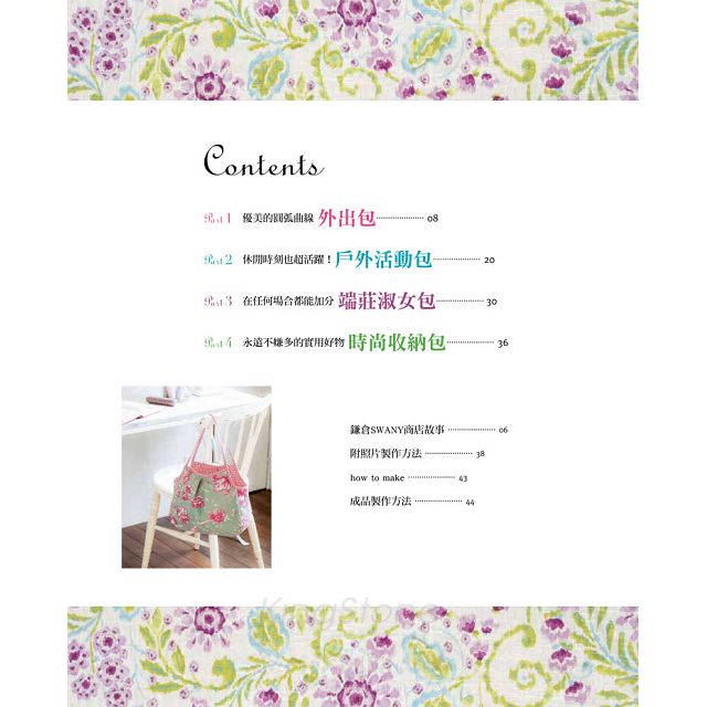 本書以製作圓弧曲線優美高雅的外出包、休閒時刻也超方便的戶外活動包、在任何場合都能加分的端莊淑女包、超實用又時尚的各種收納小包等四類為主,共34款包包。而除了款式之外,包包的花樣也依據需求而有不同搭配,有彷彿置身花園般的繽紛花朵圖樣、配色高雅素淨的簡單花紋、顏色鮮豔的普普風俏皮圖樣、洋溢著少女情懷的小碎花,就連基本條紋款式也有著與眾不同的配色!