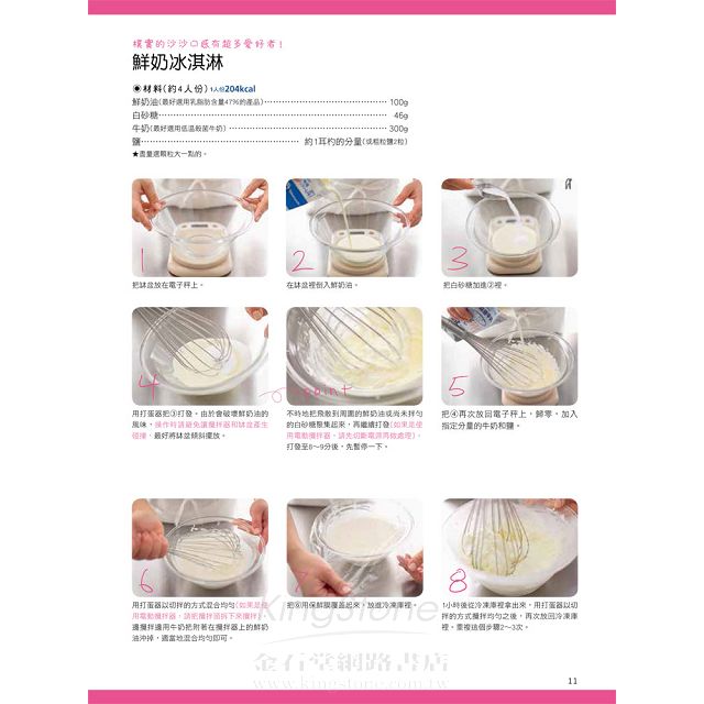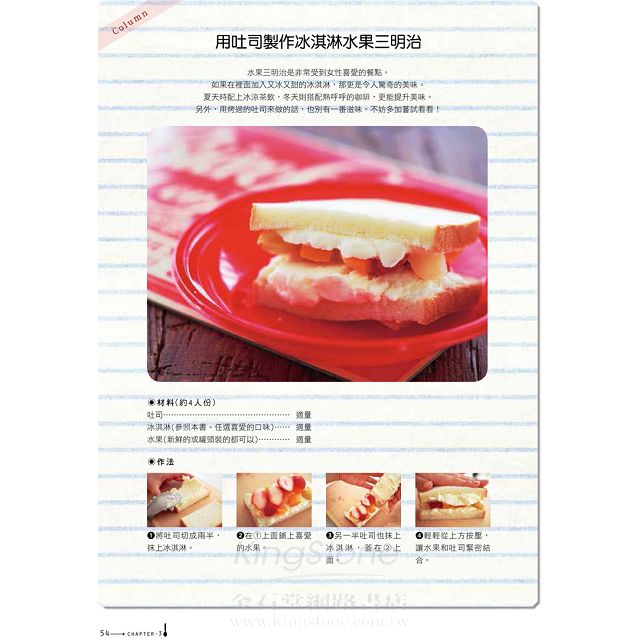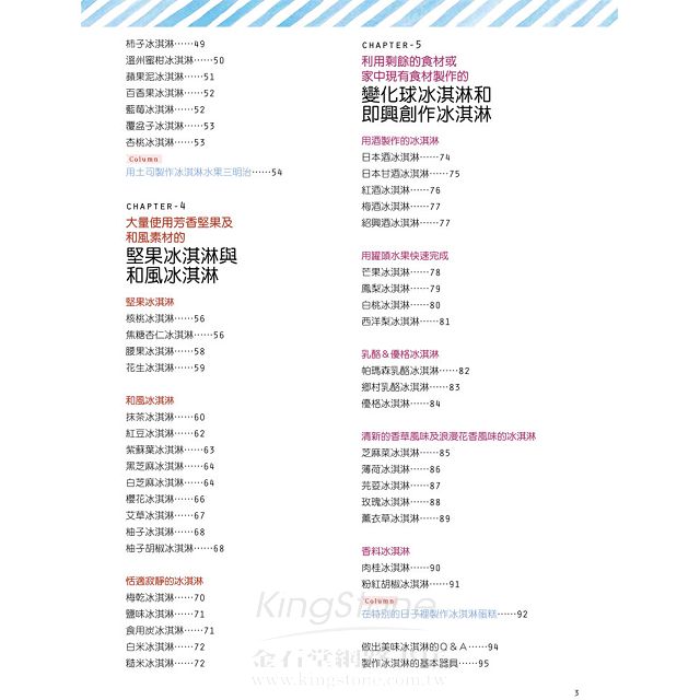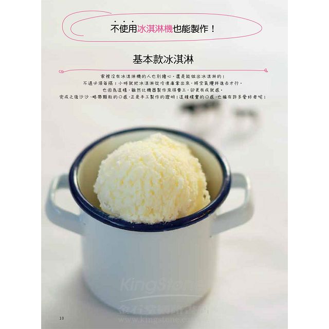 除了基本及特殊口味的冰淇淋外,書中還提供冰淇淋蛋糕及冰淇淋三明治的作法,多變的作法,怎麼吃都不會膩!