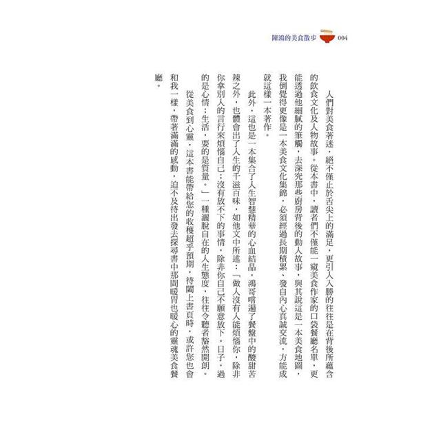 《陳鴻的美食散步》書中傳遞的,與其說是「說食」、「說美食」,不如說是「說人」、「說人生」。除了介紹大街小巷的美食之外,也搭配充滿個人情感的內容,讓我們在享用美食的同時,也了解每道料理背後蘊含的意義與廚師的人生故事,這是最令我動容的地方。例如: