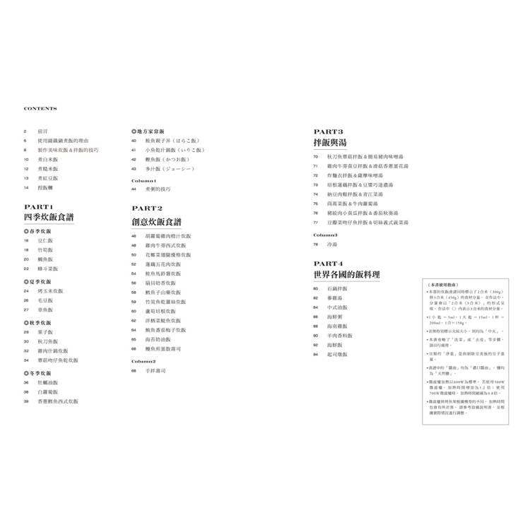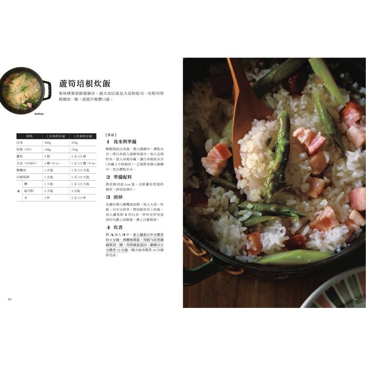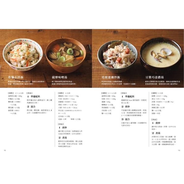 本書收錄50道一鍋式炊飯料理,從基本的白飯、糙米飯、粥,到經典栗子飯、香菇炊飯、異國風海南雞飯、蔘雞湯……甚至還有創意混搭的驚喜口味。只要一鍋主食搭配一碗湯,就能端出一道簡單卻豐盛的幸福餐食。