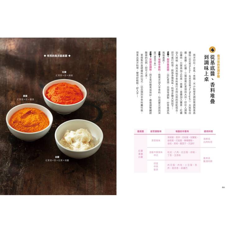 作者透過圖表,帶領讀者掌握南洋菜的料理節奏——從香料前置處理、基底醬慢火炒製,到香草入鍋時機與調味的收尾鋪陳,