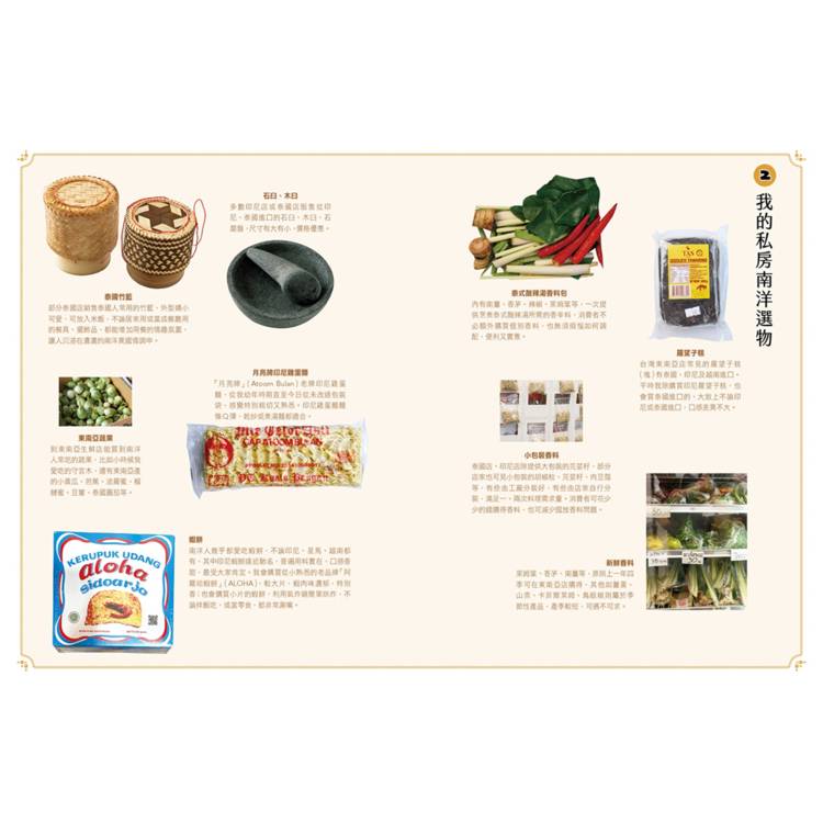 此外,為方便讀者採買南洋料理常用食材,本書還介紹東南亞店、販售南洋調味品的超市,方便讀者前往選購。書中特別介紹我從小至今常見的食材,作為採購指南。