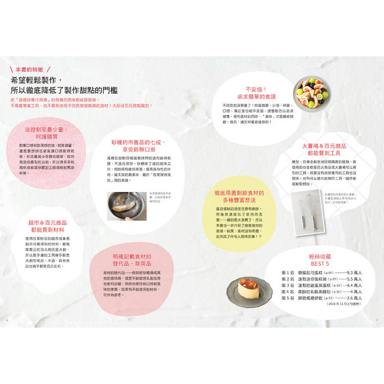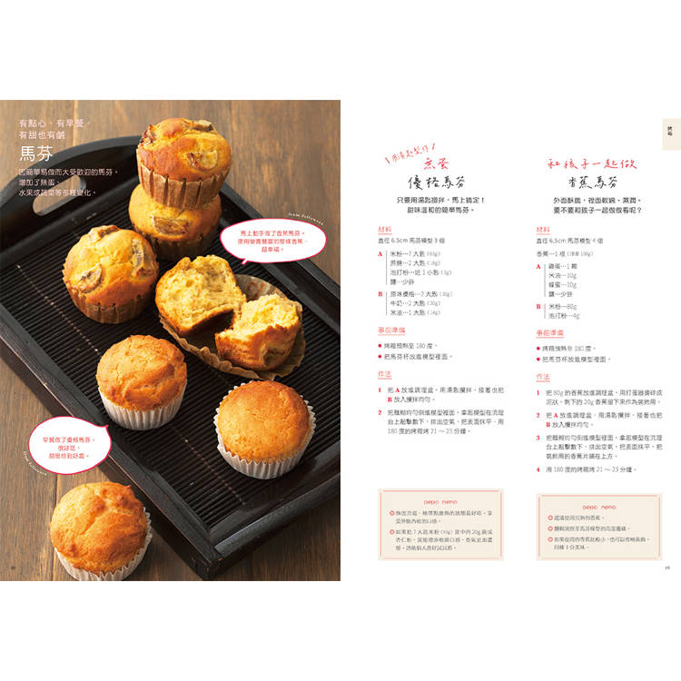同時還介紹了蒙布朗、布丁、馬芬、蛋糕捲、磅蛋糕、塔派和裝飾蛋糕等正統的甜點,等稍微熟練之後,大家就可以試著挑戰。