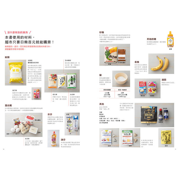 因此,因為希望隨時都可以輕鬆做,所以本書介紹的都是少糖、少油,有益身體健康的甜點,而且只要用手邊的材料就能完成。完全不使用那些沒用完就很難處理的食材,或是只有網路才買得到的食材。另外,道具也幾乎百元(百元商店)就可以買到。