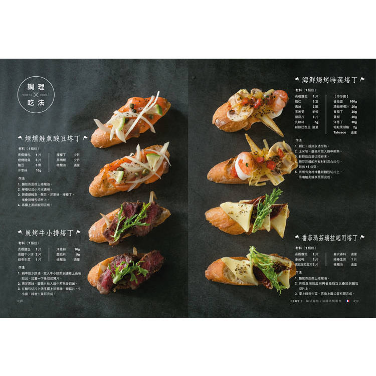 〈調理與吃法〉煙燻鮭魚塔丁/炭烤牛小排塔丁/海鮮焗烤時蔬塔丁/番茄瑪茲瑞拉起司塔丁