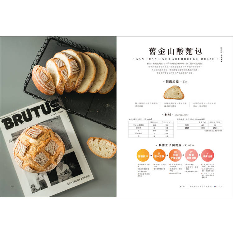 綜觀本書除收集彙整了各式麵包配方,並有系統性的將其分類:歐式、義式、日式、台式等大類別,再依序從類別中找到代表性麵包,爾後再延伸至三明治的組合,產品風味:從單一風味到多元調理組合。產品定位:從早餐食用到午餐餐盒再至晚餐佐餐麵包。產品外觀:從簡單樸實到複雜華麗,成功的將技術提昇至藝術。