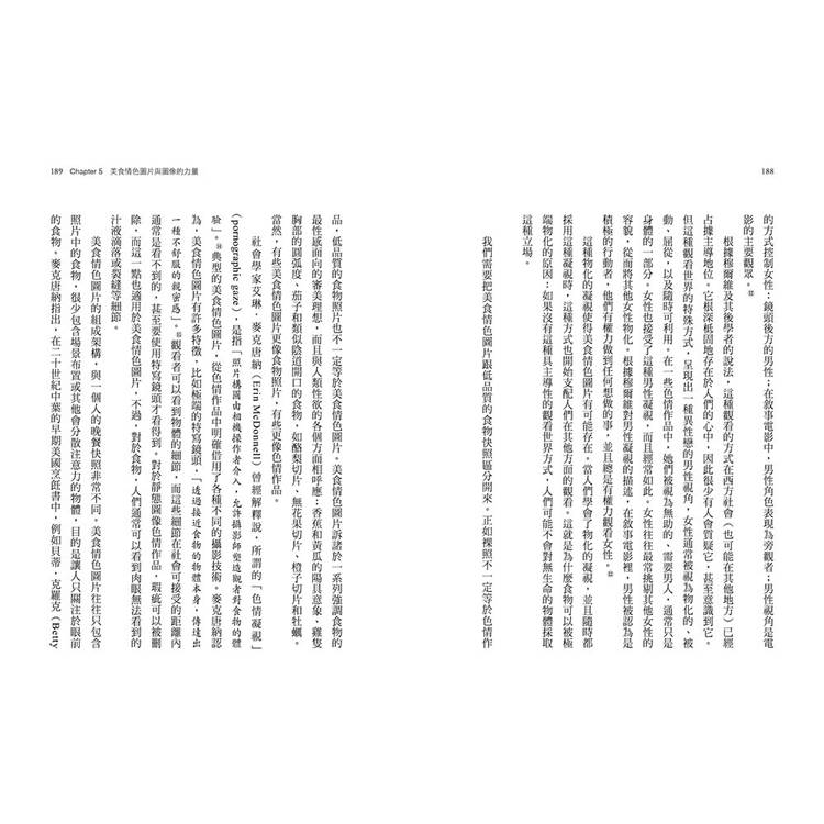 人們從美食情色圖片中獲得的視覺愉悅,如何挑戰看待女性、食慾、愉悅和飽足感的一些觀念?美食情色圖片可以取代真正的食物嗎?或者人類真的是視覺生物,因此美食情色圖片是人類參與周圍世界的自然樂趣的一部分嗎?美食情色圖片是人類視覺文化的一部分,但那種食物圖像創造慾望的方式,會對人們與食物的關係產生了負面影響,這是因為「期望」在人們的慾望(食物、性、愛)裡的作用方式,與人們所看到和經歷的現實之間並不相稱。由於食物和性都有著深刻的具身(embodied)性質,因此這兩者以重要的方式連結在一起。然而,當人們把這些物質需求、慾望和滿足的焦點,轉移到視覺替代品上時,將會減少真正滿意的愉悅感。也就是說,美食情色圖片和性愛情色圖片改變了人們與食物和性之關係的性質。廚師說,人們總是先用眼睛吃,然後用鼻子吃,最後才用嘴巴吃。在本章,我將研究人們用眼睛吃東西的方式。