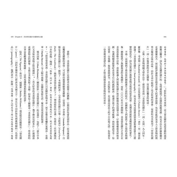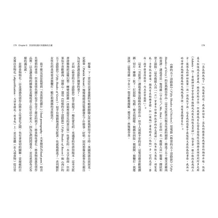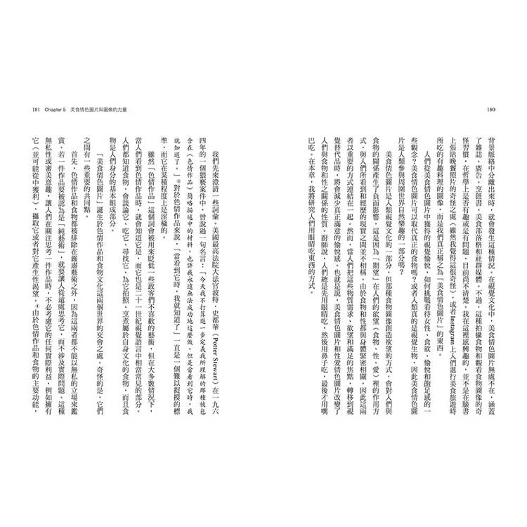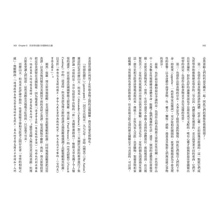 我們先來澄清一些詞彙。美國最高法院大法官波特.史都華(Potter Stewart)在一九六四年的一個猥褻案件中,曾說過一句名言:「今天我不打算進一步定義我所理解的那種被包含在(色情作品)簡略描述中的材料,也許我永遠無法成功地這麼做。但是當看到它時,我就知道了。」對於色情作品來說,「當看到它時,我就知道了」一直是一個難以捉摸的標準,而它在某種程度上是淫穢的。雖然「色情作品」這個詞會被用來貶低一些政客們不喜歡的藝術,但在大多數情況下,當人們看到色情作品時,就會知道它是,而它也是二十一世紀視覺語言中相當常見的部分。人們也都知道食物,會談論它、吃它、尋找它、為它拍照、烹煮屬於自身文化的食物,而且食物是人們身分的基本組成部分。