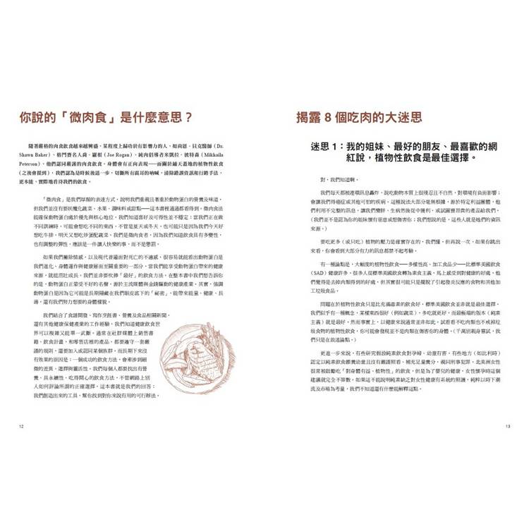 「微肉食」是我們厚顏的表達方式,說明我們重視且著重於動物蛋白的營養及味道。但我們並沒有要妖魔化蔬菜、水果、調味料或甜點——這本書裡通通都看得到。微肉食法能確保動物蛋白處於優先與核心地位,我們知道喜好及可得性並不穩定:當我們正在做不同訓練時,可能會想吃不同的東西,不管是夏天或冬天,也可能只是因為我們今天好想吃牛排,明天又想吃炒蛋配蔬菜。我們是微肉食者,因為我們知道飲食具有多變性,也有調整的彈性,應該是一件讓人快樂的事,而不是懲罰。