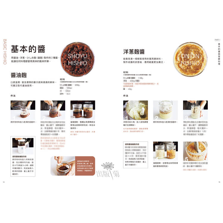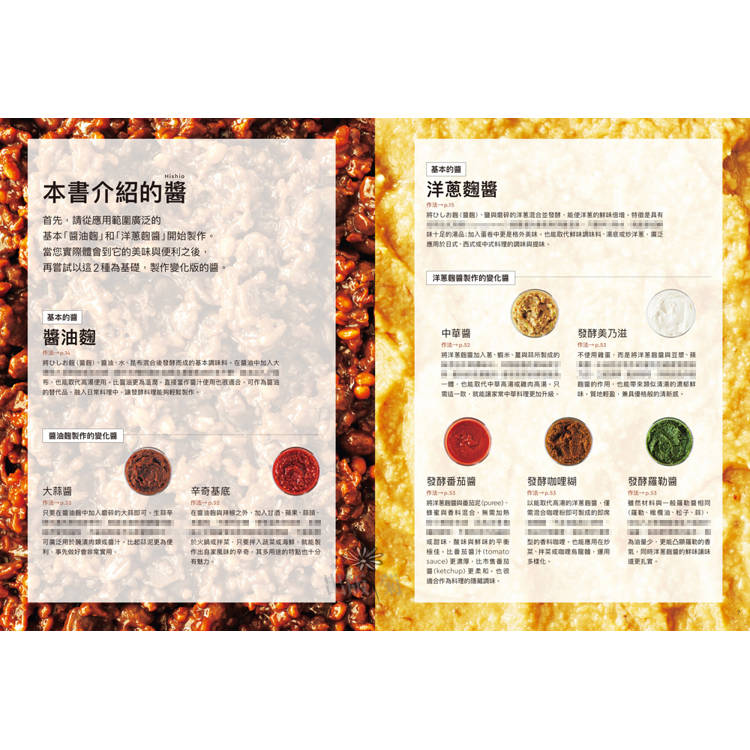 本書以「ひしお麴(醬麴)」為材料,用非常簡單易學、保存性高的方式製成16 種發酵醬,包括: