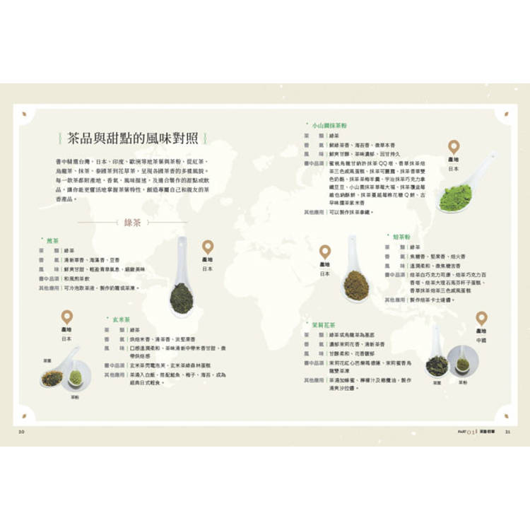 茶不僅是人們日常生活中的飲品,它還能為中西式點心增添獨特的風味。根據不同點心的特性,選擇合適的茶款入甜,能讓風味更加突出。品種╳風土╳製程=獨一無二的茶,書中茶類橫跨五大系: