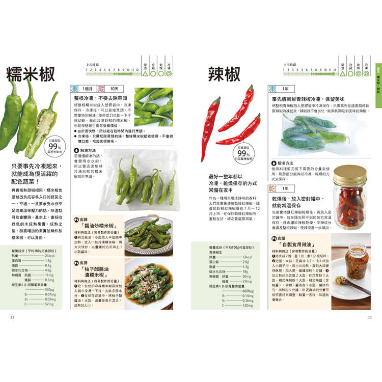 每種食材下附有簡易食譜,不但教你認識食材,更教你保存與烹調方式,讓你找到最佳的賞味秘訣!