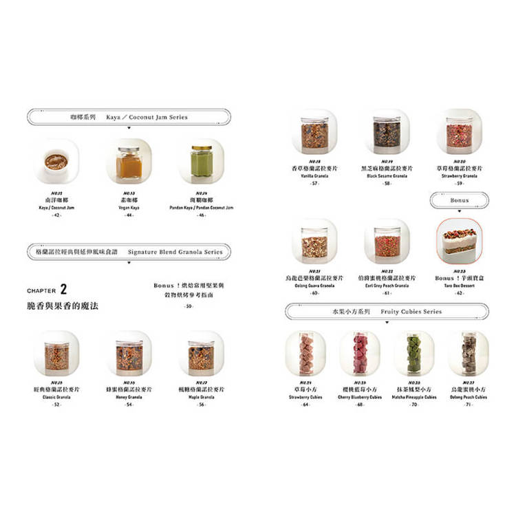 從麵茶花生的復古香氣,到椰香斑斕的南洋甜味,本書以6款經典臺味零嘴與28款異國南洋風點心,帶你走進兩地職人的風味日常。無論是水果醬、堅果研磨醬、脆香小點,還是節慶必備的黃梨卷、邦吉餅乾與小塔,每一道都被設計成「簡單做、好攜帶、能分享」的甜點形式。
