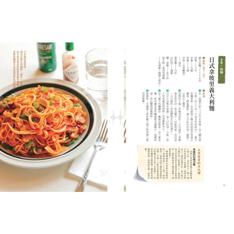 七十七道的大眾食堂料理,其實不用道道都做,挑自己喜歡的,只要精通三分之一,就很值回票價。而且,日本飲食多元的緣故,書中不盡然全是純日式菜系,像是韓式涼拌菜、近期因電視劇走紅的拿坡里義大利麵,書中也有詳盡的作法。