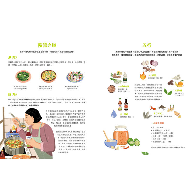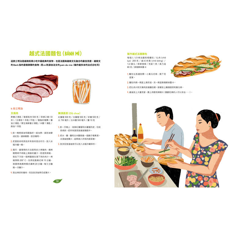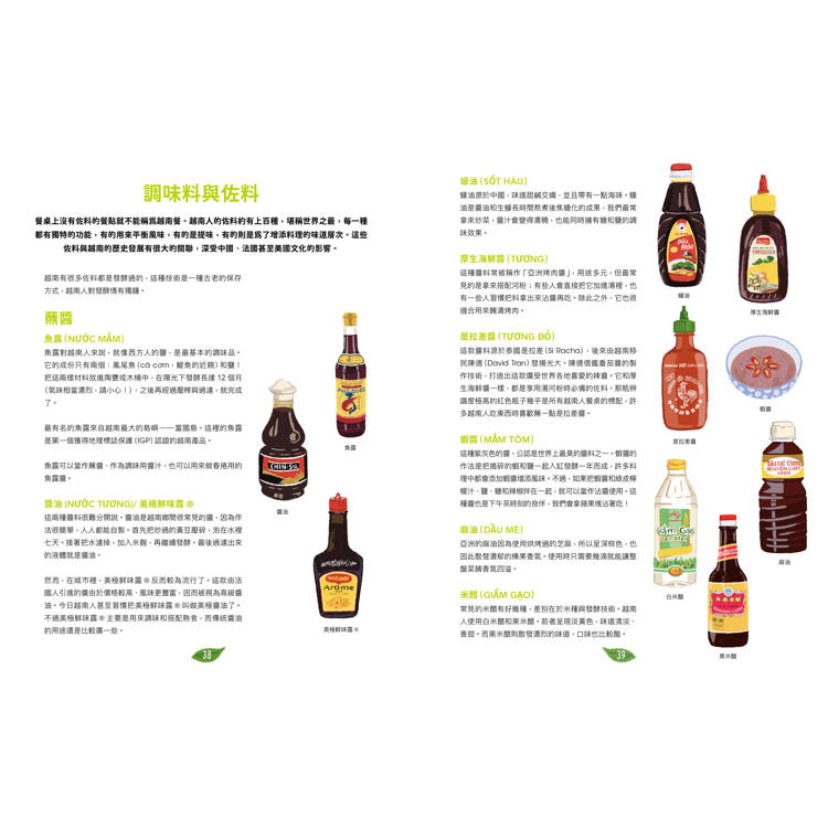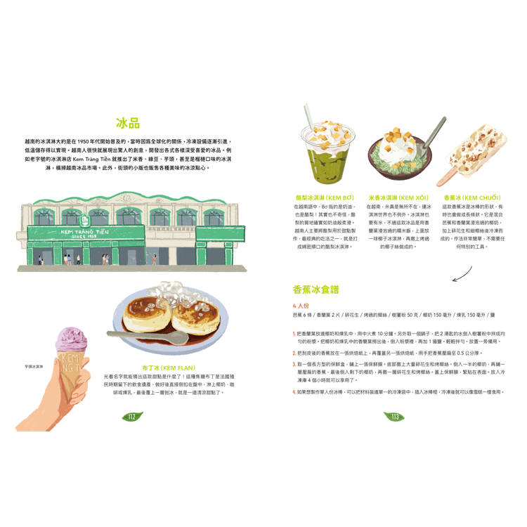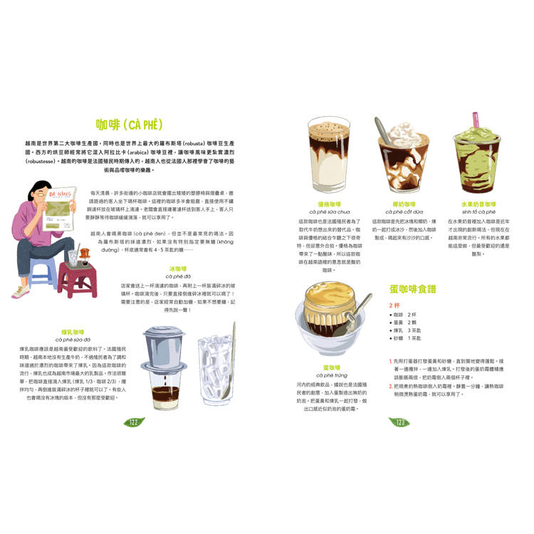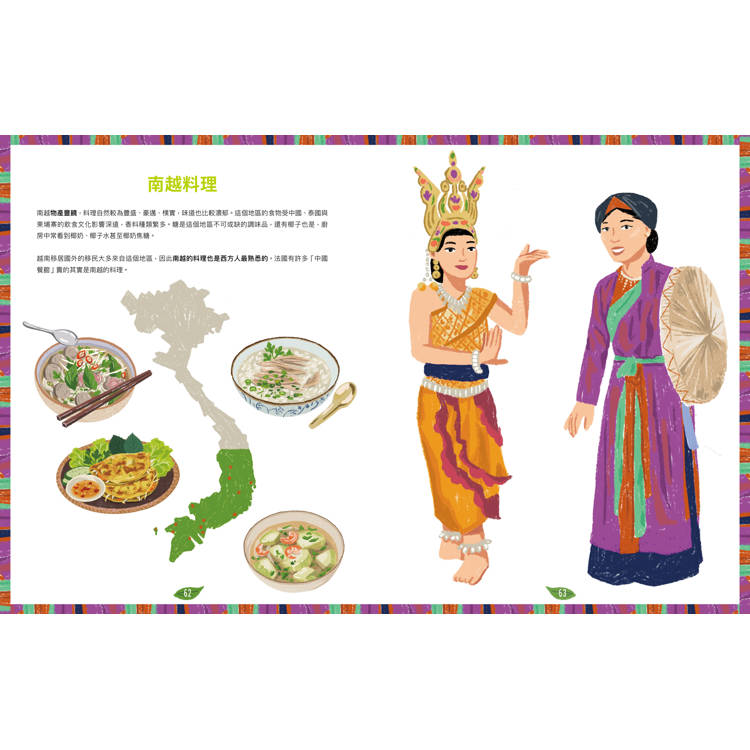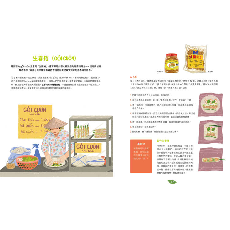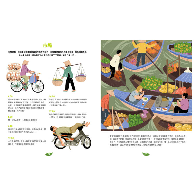 本書將歷史背景、節慶傳統、市場文化、宗教信仰,一一化為溫馨可愛的插畫、簡單易懂的介紹,帶你貼近越南人的餐桌與生活: