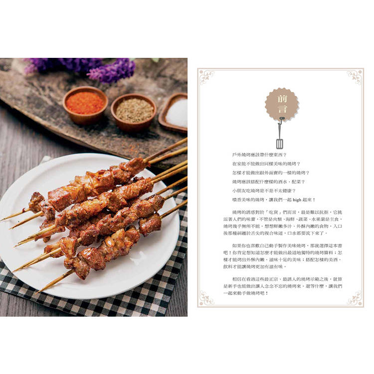 本書收錄了近100道燒烤美味,每一種都滋味無窮,讓每個人都能各享所愛。書中還介紹了燒烤的材料選購、燒烤工具清單、祕製醬料、配餐涼拌、搭配飲料等基礎知識。同時提供戶外烤和家烤兩種燒烤方式,並貼心的推薦了適宜搭配的美酒和美味祕方。最後還專門推薦了適合小朋友食用的健康燒烤。相信在看了這些最道地、最誘人的燒烤示範後,就算是新手,也能做出讓人吮指的美味!