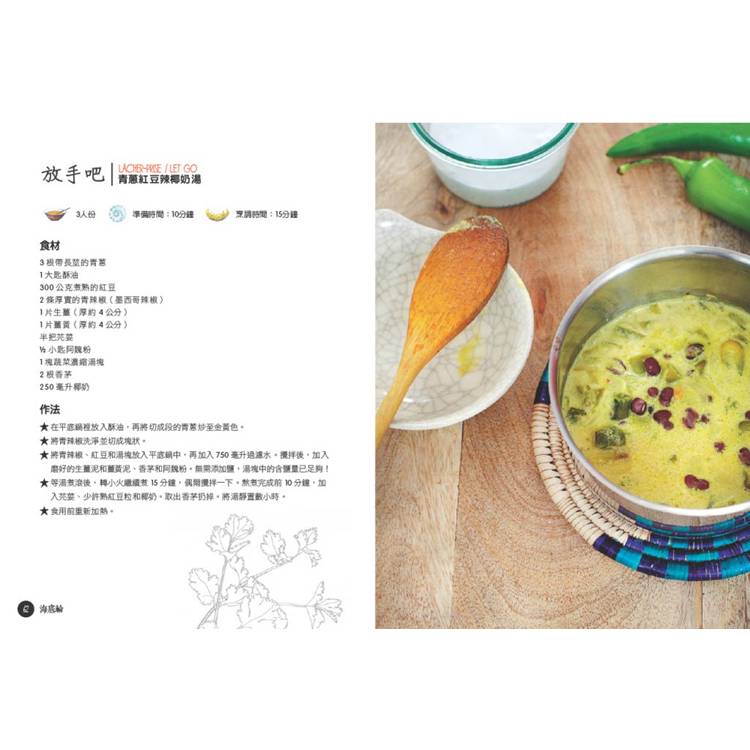 書中的每一道湯品均有專屬命名:純粹喜悅、地中海、接納、母性⋯⋯每道湯都向我展現著它自己,因為它們並不屬於我。它們所喚起的情感,是一種愛的狀態。它們啟發著我,亦能激勵人心,撫慰並滋養人心。在烹煮的過程,請你進入全然專注的冥想中。存在於當下的,如同冥想源頭的,也就是「愛」,這才是此時必須融入的。烹飪和用餐即是一種當下。你要感覺自己是以每個味覺細胞都在歡舞般的狀態來品嚐食物,而它也會滋養著你。用餐時,你是在跟食物談戀愛。不用心的愛,是無法令人滿足的。臣服於這一獨特的時刻吧,存在於唯一的當下,也就是生活中;每一個當下皆蘊含著永恆。重新感受你的全然狀態。就讓食物填補你,並喚起你所有的感官:視覺、觸覺、味覺、嗅覺……探險開始!