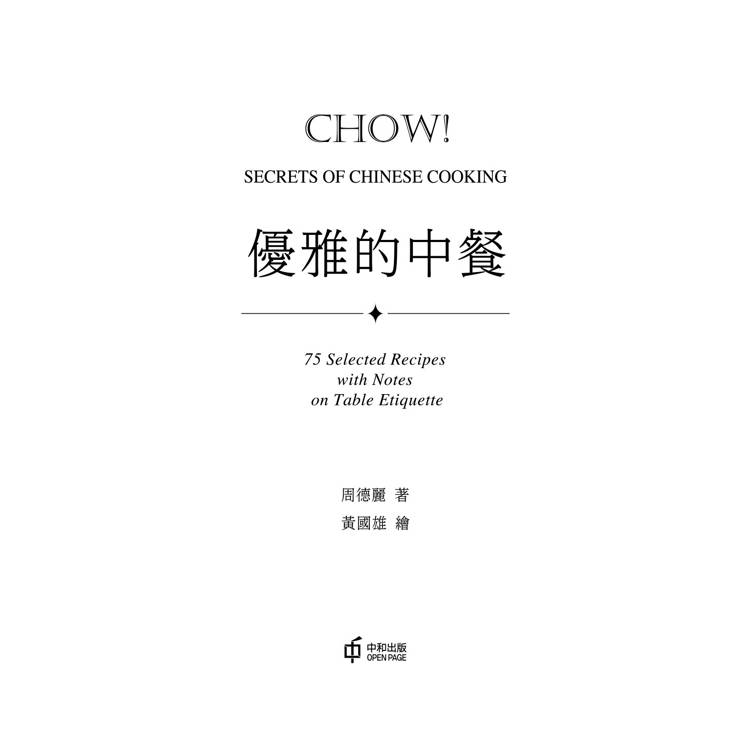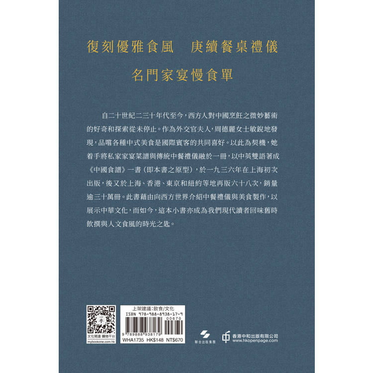 ??自二十世紀二三十年代至今,西方人對中國烹飪之微妙藝術的好奇和探索從未停止。作為外交官夫人,周德麗女士敏銳地發現,品嚐各種中式美食是國際賓客的共同喜好。以此為契機,她?手將私家家宴菜譜與傳統中餐禮儀融於一冊,以中英雙語著成《中國食譜》一書(即本書之原型),於一九三六年在上海初次出版,後又於上海、香港、東京和紐約等地再版六十八次,銷量逾三十萬冊。此書藉由向西方世界介紹中餐禮儀與美食製作,以展示中華文化,而如今,這本小書亦成為我們現代讀者回味舊時飲撰與人文食風的時光之匙。