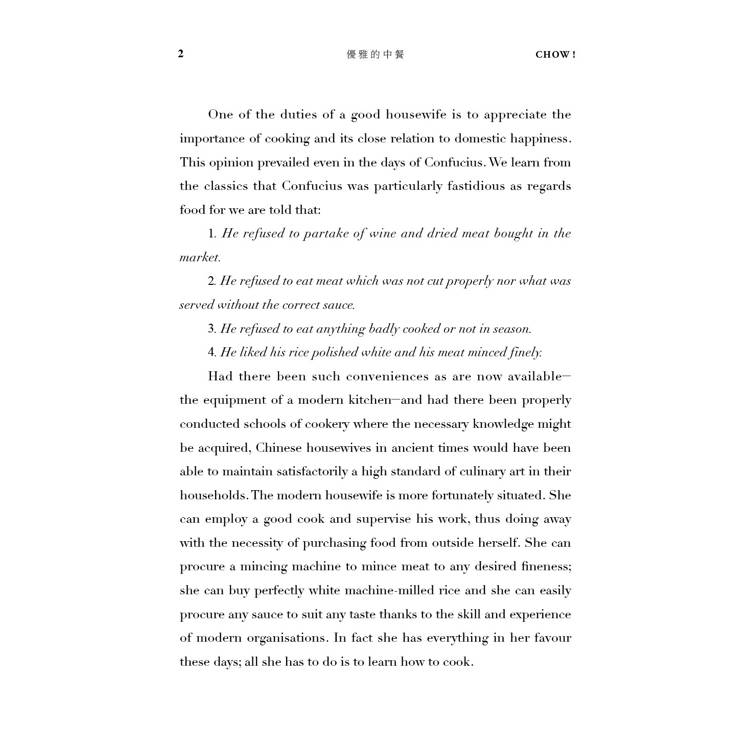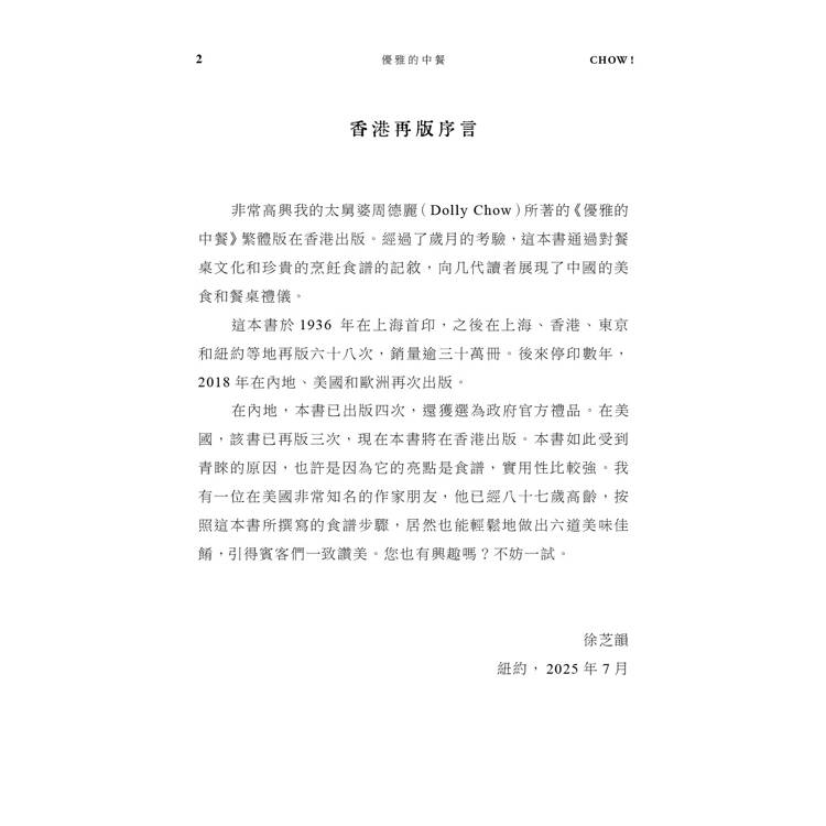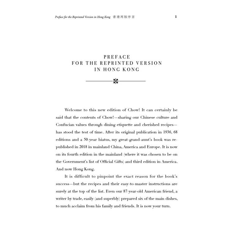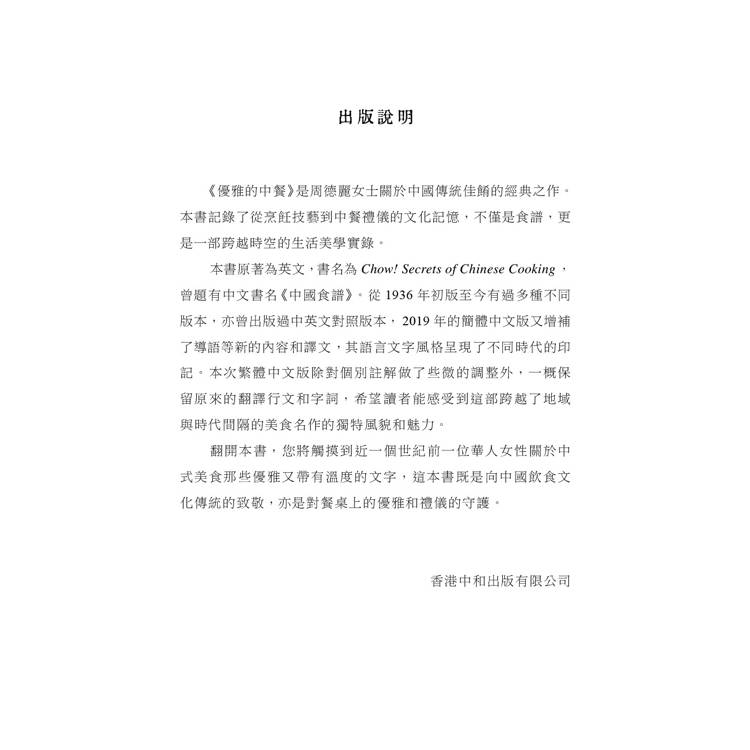 本書原著為英文,書名為Chow! Secrets of Chinese Cooking,曾題有中文書名《中國食譜》。從1936年初版至今有過多種不同版本,亦曾出版過中英文對照版本,2019年的簡體中文版又增補了導語等新的內容和譯文,其語言文字風格呈現了不同時代的印記。本次繁體中文版除對個別註解做了些微的調整外,一概保留原來的翻譯行文和字詞,希望讀者能感受到這部跨越了地域與時代間隔的美食名作的獨特風貌和魅力。