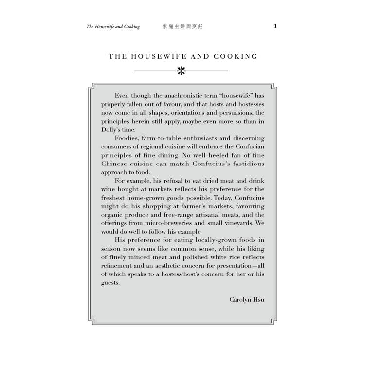 翻開本書,您將觸摸到近一個世紀前一位華人女性關於中式美食那些優雅又帶有溫度的文字,這本書既是向中國飲食文化傳統的致敬,亦是對餐桌上的優雅和禮儀的守護。