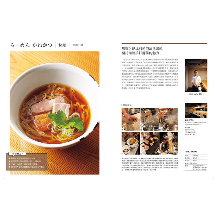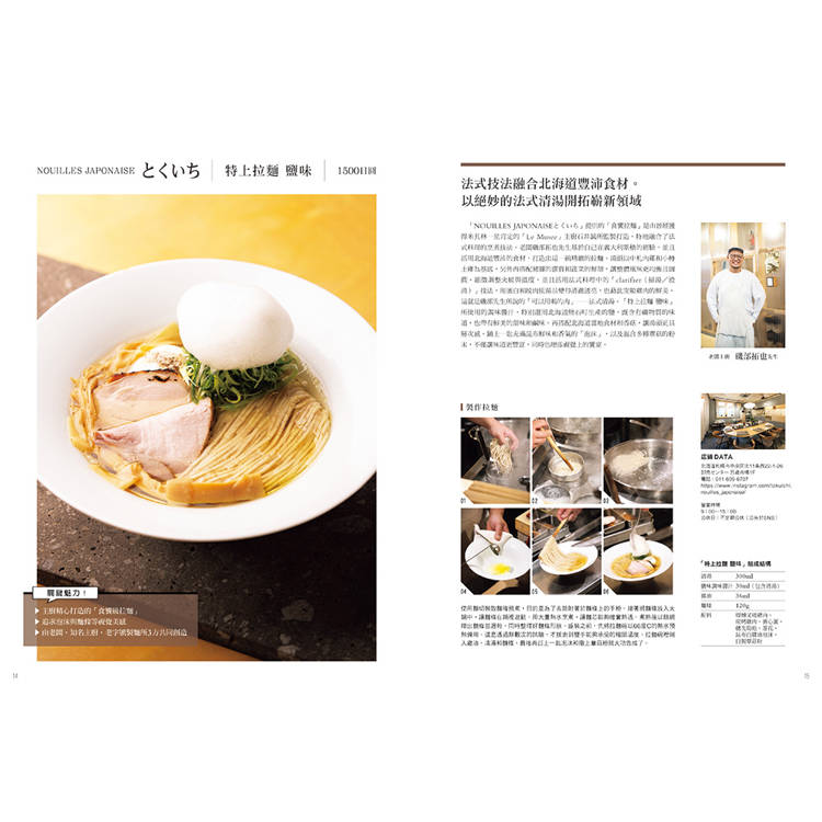 雞+豬清爽湯頭、美食拉麵、自家製粉.自家製麵、雞肉海鮮清湯、NEO家系、濃郁雞湯頭、魚乾+豬清湯、加點調味麵條、沾麵螺旋狀擺盤、貝類高湯+雞湯頭……多種湯頭與吃法。