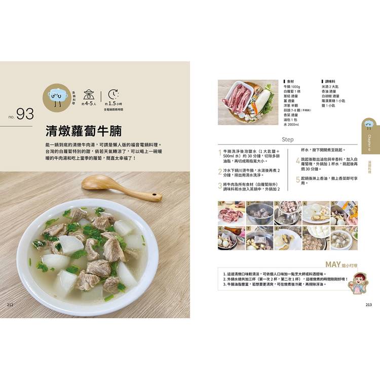 湯類料理:刈菜雞湯/冬瓜肉丸蛤蜊湯/古早味蔭瓜香菇雞湯/白蘿蔔肉片湯/哈佛蔬菜湯(豬肉篇)/茭白筍肉羹湯/清燉蘿蔔牛腩/番茄酸辣湯/酸菜蛤蜊虱目魚肚湯/豬肉味噌湯