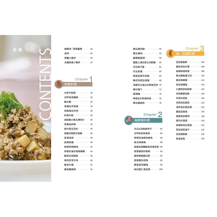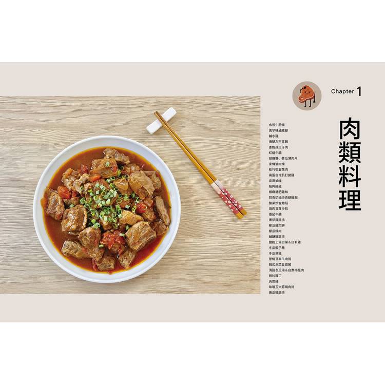 肉類料理:水煎牛肋條/古早味滷豬腳/鹹水雞/低醣左宗棠雞/杏鮑菇瓜仔肉/紅燒牛腩/胡麻醬小黃瓜薄肉片/家傳滷肉燥/桂竹筍五花肉/高蛋白增肌打拋雞/高湯滷味/紹興醉雞/椒麻舒肥雞絲/蒜香奶油炒香菇雞胸/酸菜炒杏鮑菇/燒肉豆芽沙拉/番茄牛腩/番茄雞腿排/櫛瓜雞肉餅/櫛瓜鑲肉/鹹酥雞腿排/鹽麴上湯白菜&白斬雞/冬瓜骰子豬/冬瓜蒸雞/蔥燒豆腐牛肉捲/韓式泡菜豆腐豬/清甜冬瓜湯&白煮梅花肉/辣炒雞丁/黃燜雞/味噌玉米筍燒肉捲/黃瓜雞腿排