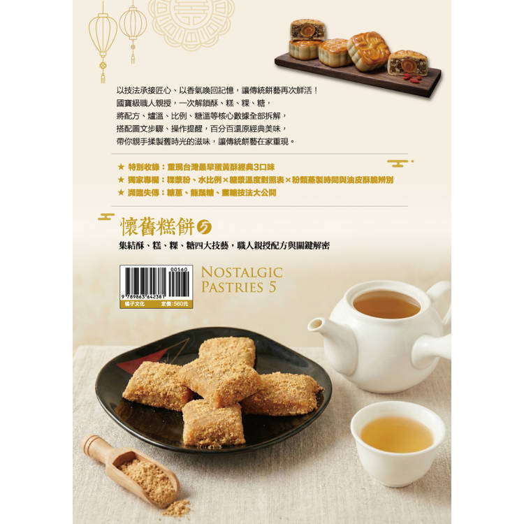 這次新出版的《懷舊糕餅》第五集,同樣收錄了不計其數且非常罕見的傳統糕點食譜。早期製作糕餅講求的是口傳心授,幾乎沒有正式的文字記錄,有些師傅因為擔心徒弟們偷師,難免會希望這裡、那裡藏一手,而風雨師傅一反常態,毫無保留地將最寶貴的幾十年經驗全部濃縮在這本書當中,甚至包括了如今不再復見的臺灣最早蛋黃酥。