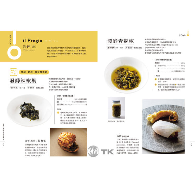 星級餐廳究竟製作哪些調味料?又是如何應用在料理中?本書收錄長期投入自製調味料研究的6位跨法義日中料理的專業主廚,傳授獨家的風味關鍵調味料176種,介紹他們店內實際使用的各種獨創調味料與運用方式。包括: