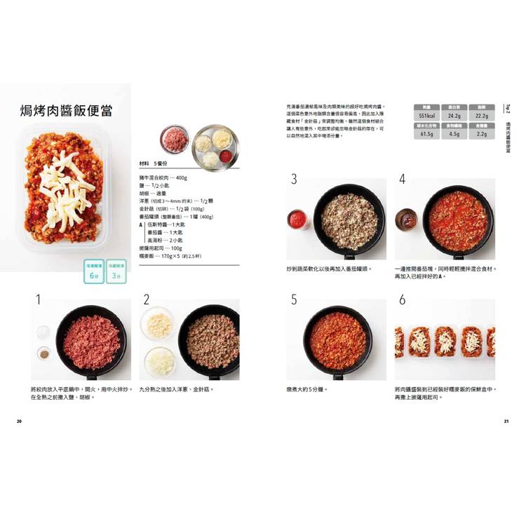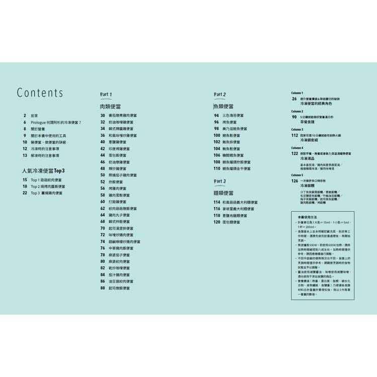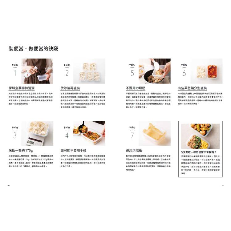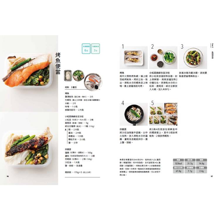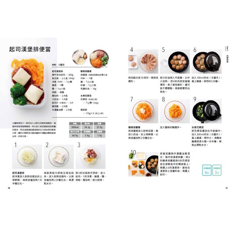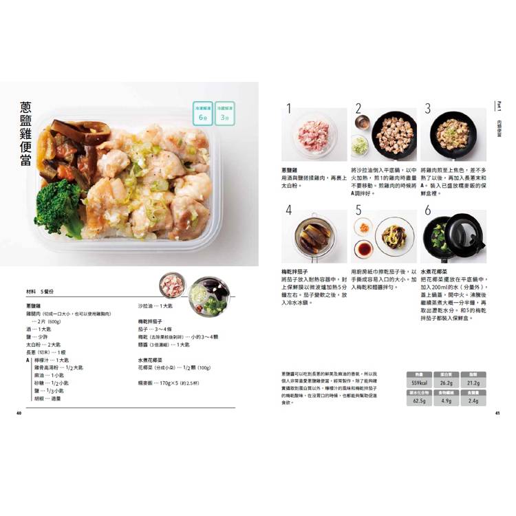 2.每一個便當的製作都以省時省錢為基礎概念設計,即使廚房新手也能輕鬆上手。每一個便當的解凍(冷凍/冷藏)微波時間清楚標示。