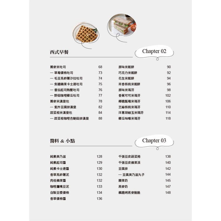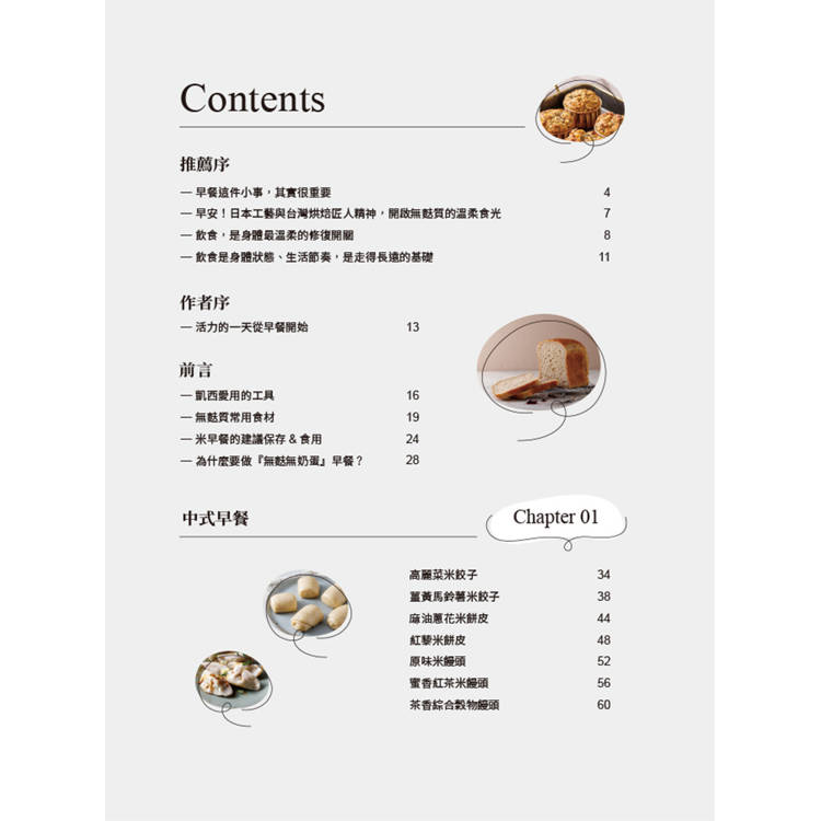 那麼全素 / 無麩早餐可以有什麼選擇?飯糰、清粥小菜、沙拉、隔夜燕麥……有點了無新意。這本書裡涵括了中 / 西式常見的早餐品項,以及飲品 / 點心類,以方便製作與美味為主旨,減低食材上的負擔,輕鬆滿足第一餐的美好。