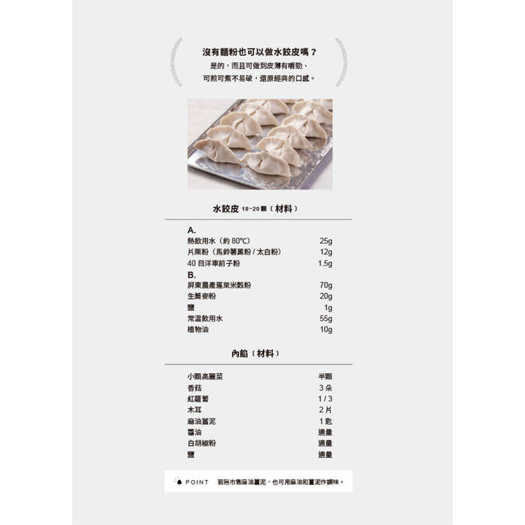市面上的各種麵包、甜點、麵點總是和你無緣,這本專為麩質過敏族群設計的食譜菜單,麵粉蛋奶out,而是以米穀粉製作的麵包、瑪芬、水餃、餅皮,美味度不減,確更健康了!