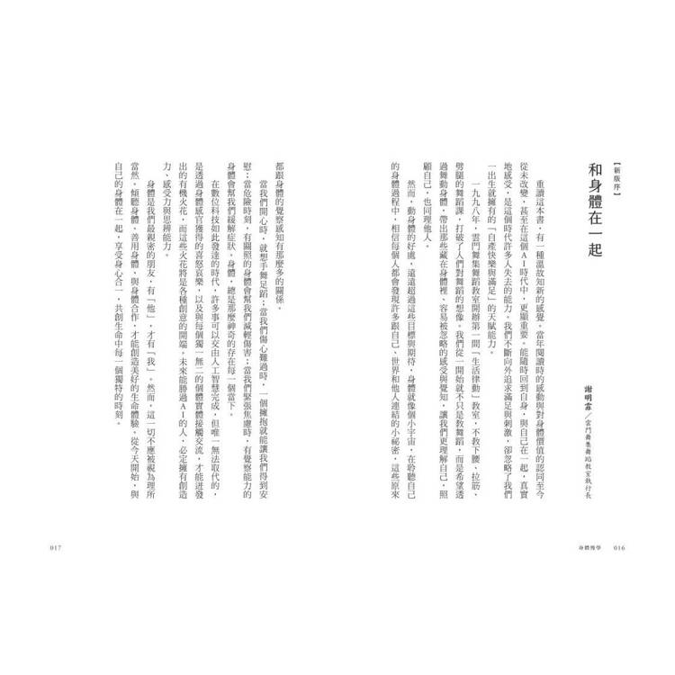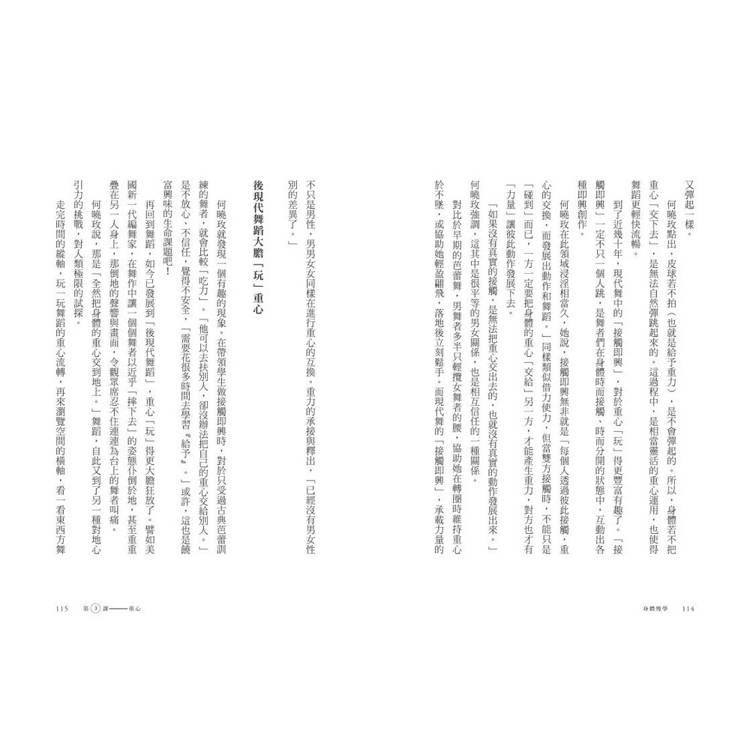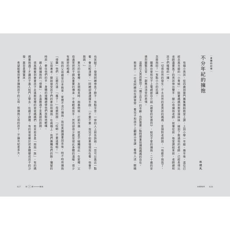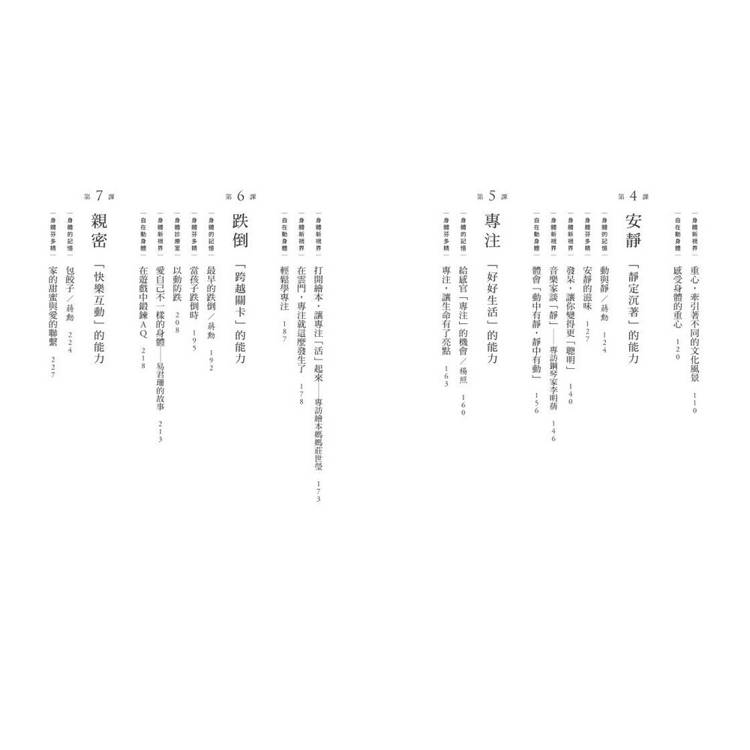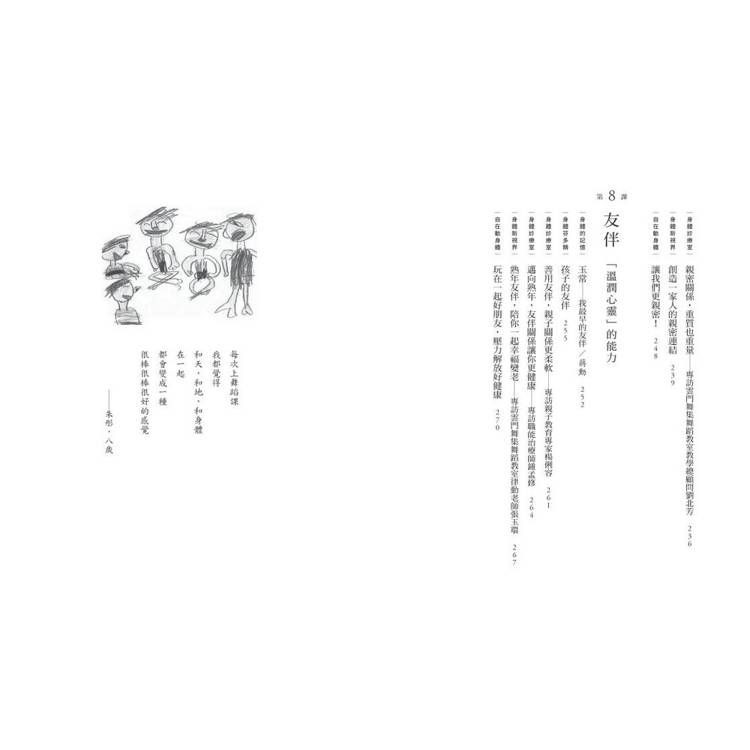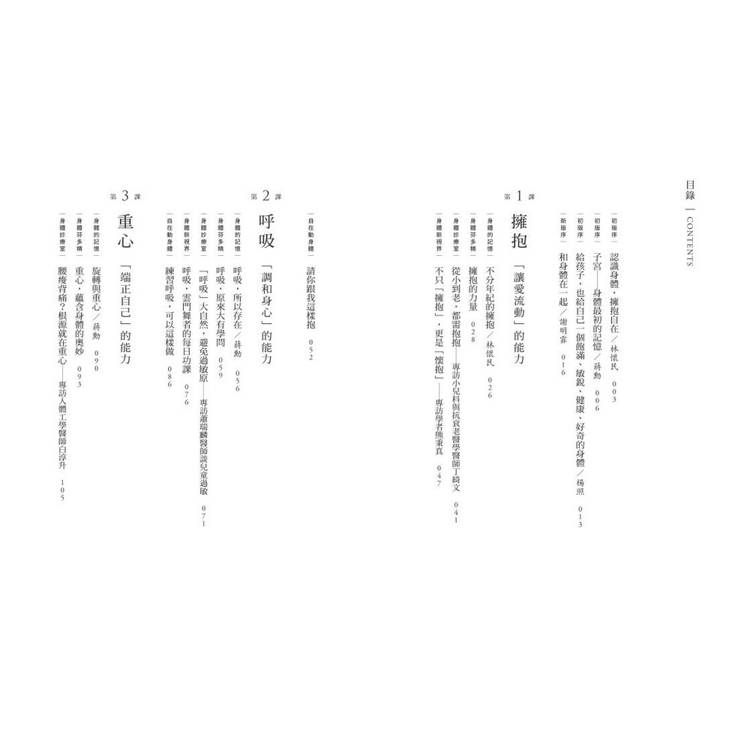 身體很簡單,也不簡單。「擁抱、呼吸、重心、安靜、專注、跌倒、親密、友伴」,是身體的功課,也是覺知美好的練習:讓愛流動、調和身心、端正自己、靜定沉著、好好生活、跨越關卡、快樂互動、溫潤心靈……