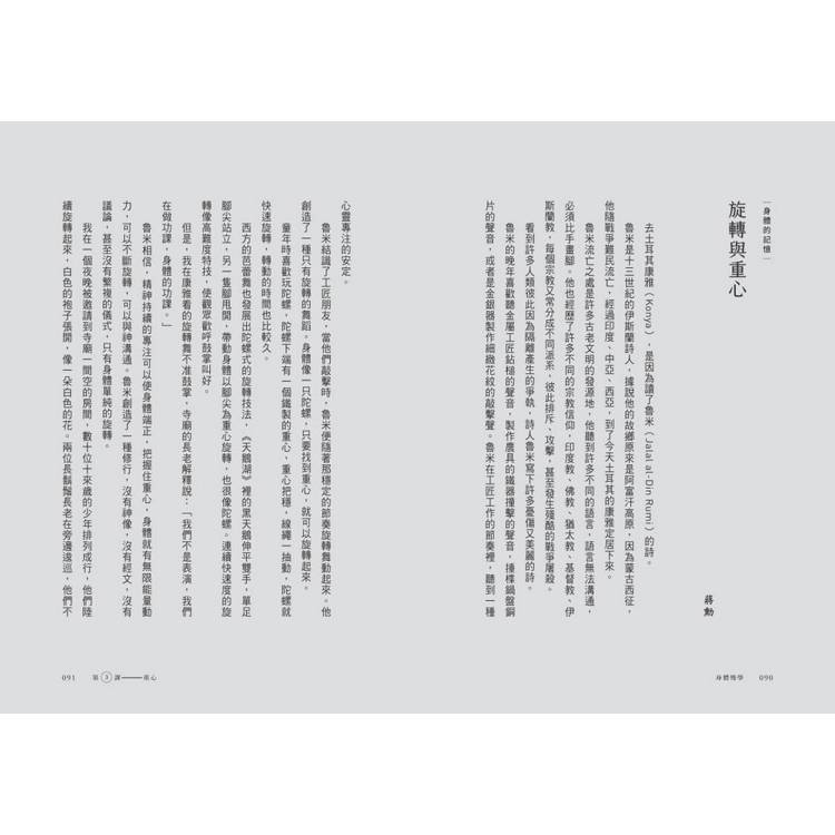 我在一個夜晚被邀請到寺廟一間空的房間,數十位十來歲的少年排列成行,他們陸續旋轉起來,白色的袍子張開,像一朵白色的花。兩位長鬍鬚長老在旁邊逡巡,他們不說話,只是細心觀看。看到一名少年身體傾斜了,長老才緩步趨前,靠近少年,附在耳邊說兩句話,少年便又恢復了端正,繼續如花一般旋轉。長達三、四小時的旋轉,彷彿一種身體的冥想。
