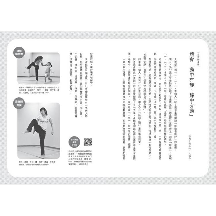 掃描書中QR-code,觀看、聆聽雲門舞集舞蹈教室影音。一起練習呼吸、舒展、玩遊戲,把書中理念化為身體的行動與記憶。