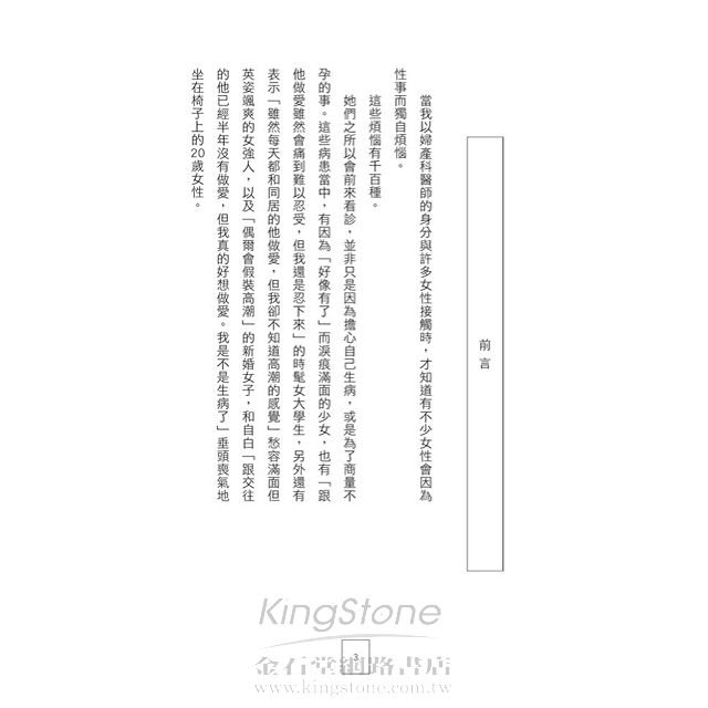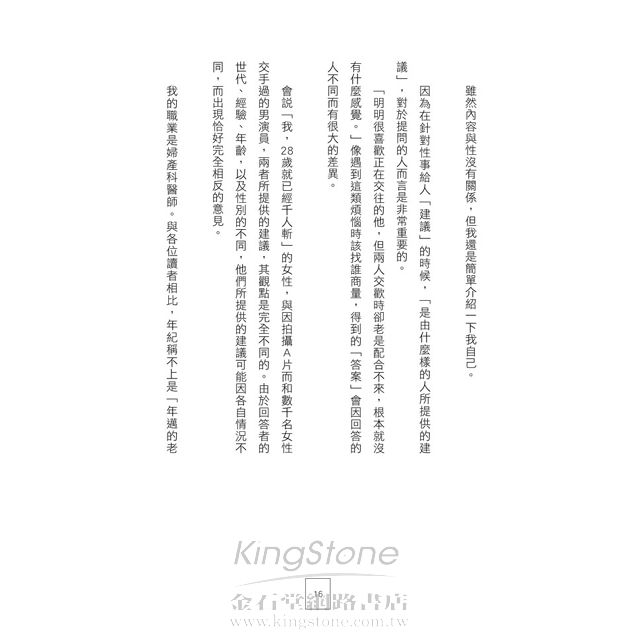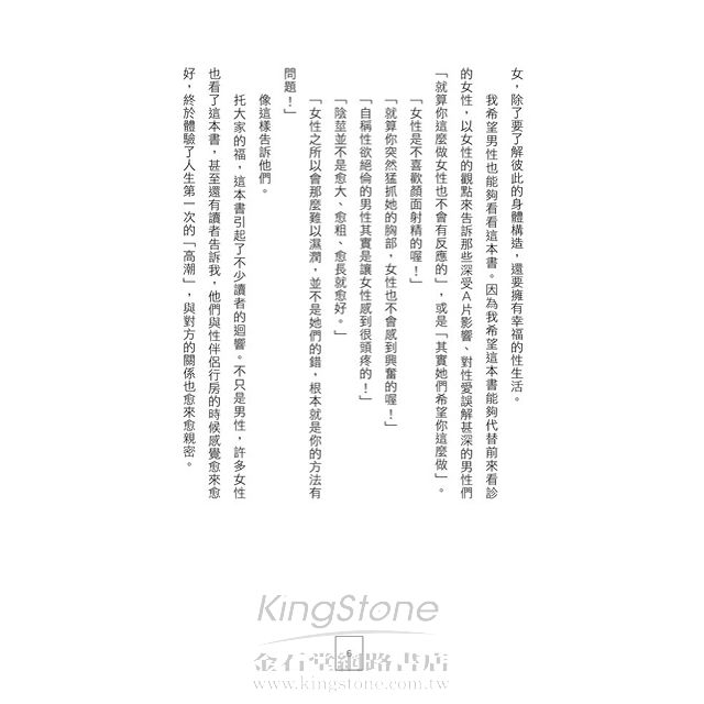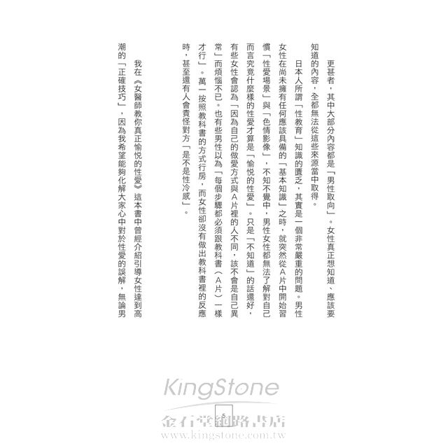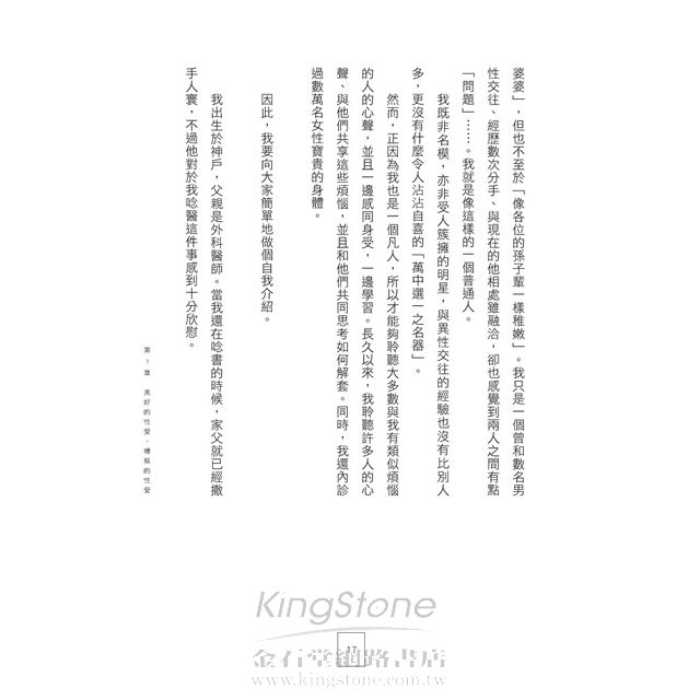 我希望男性也能夠看看這本書。因為我希望這本書能夠代替前來看診的女性,以女性的觀點來告訴那些深受A片影響、對性愛誤解甚深的男性們「就算你這麼做女性也不會有反應的」,或是「其實她們希望你這麼做」。