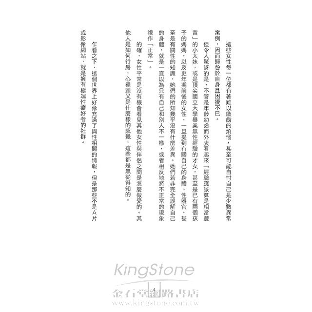但令人驚訝的是,不管是年齡幼齒而外表看起來「經驗應該算是相當豐富」的小太妹,或是頂尖國立大學畢業無性經驗的才女,甚至是已有兩個孩子的媽媽,以及更年期前後的女性,一旦提到有關自己的身體、性器官,甚至是有關性的知識,她們的所知幾乎沒有什麼差異。她們不是完全誤解自己的身體,就是一直以為只有自己和別人不一樣,或者相反地將不正常的現象視作「正常」。