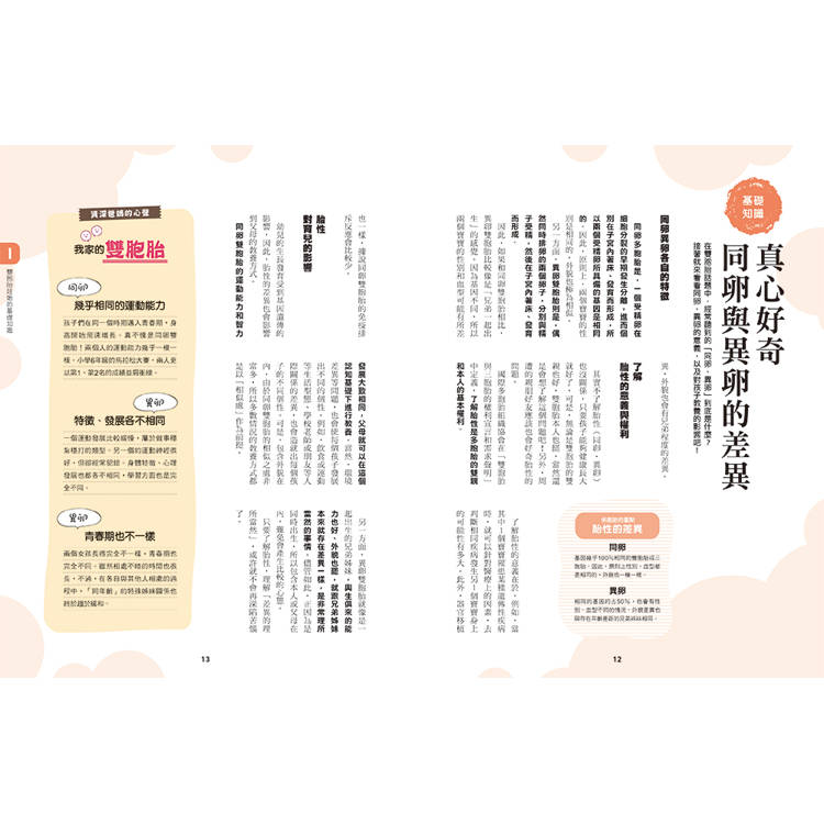 本書收錄長年研究多胞胎的大學教授、協助雙胞胎家庭的志工、支援多胞胎的開朗醫師、助產師、社區護理師、心理師與社會福利工作者等過去的研究知識,以及透過協助經驗所獲得的知識,提供雙胞胎家庭所需要的資訊及內容,可以幫助新手父母們在身心雙方面做好準備。