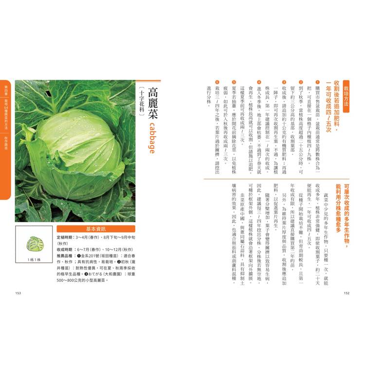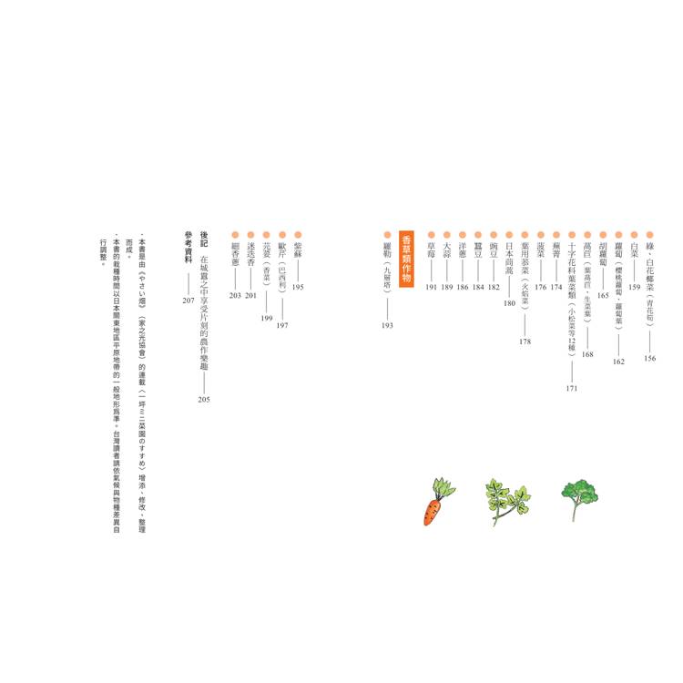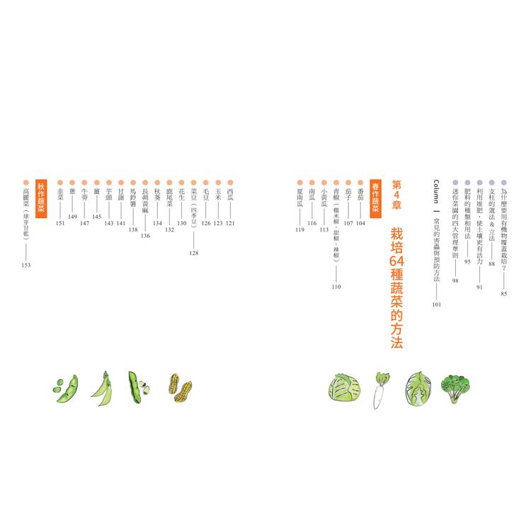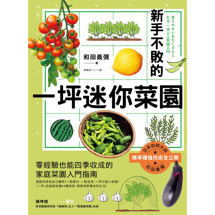 書中還詳細介紹各種關於栽種的知識,並收錄64種蔬菜的栽培訣竅,方便讀者從「不知道怎麼開始」→「日日有菜採收」!從定植時間、收獲時間、推薦品種、種植數量、栽培方法,詳細的解說,讓你一次就上手,輕鬆成為天天收菜的快樂農夫。