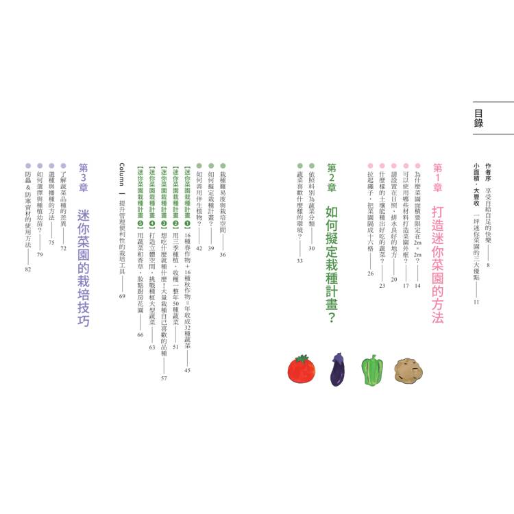 ‧圖文並茂,搭配日系插圖,一目明瞭,完全掌握迷你菜園的每一個格應該種什麼蔬菜。