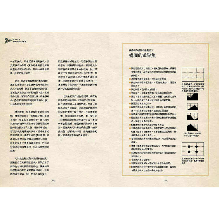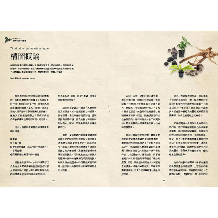 1. 充滿美感的構圖技法:24種生態缸構圖取景法,在玻璃容器或水槽中重現大自然風景,小細節調整凸顯景深、運用植物打造季節更迭感,讓生態缸美感大幅升級。