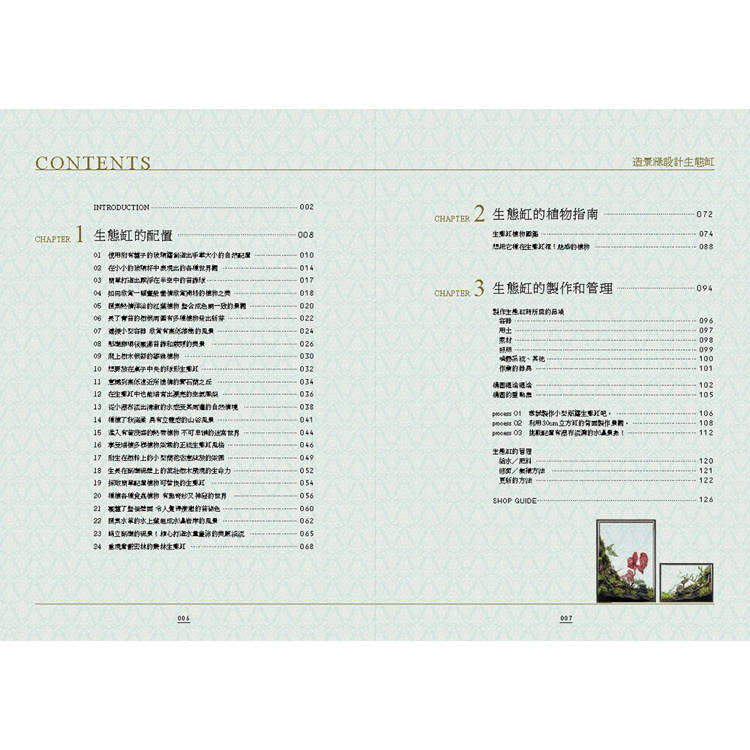 2. 豐富生態缸植物圖鑑:適合種植於生態缸中的雨林植物圖鑑,從常見的蕨類、苔蘚、觀葉植物,到美麗的秋海棠、食蟲植物,與空氣鳳梨等,讓栽培樂趣進一步拓展。