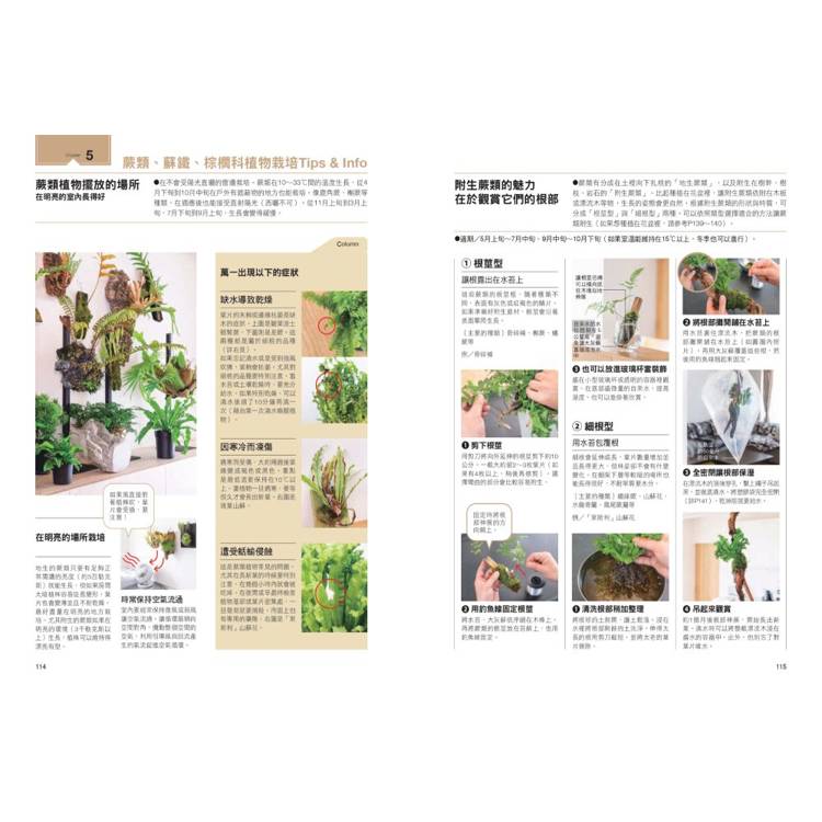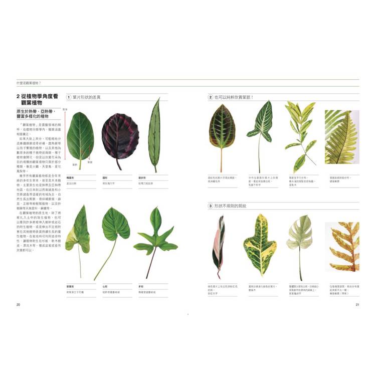 書中依照觀葉植物不同屬性與特質,提供進一步的照護培養注意要點……