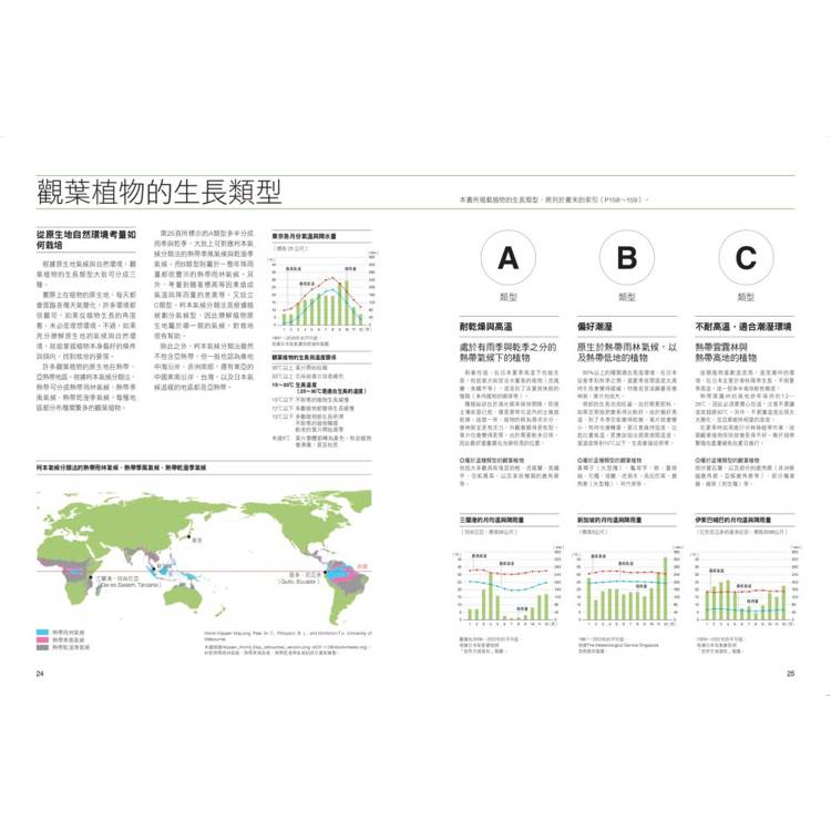 第25頁所標示的A類型多半分成雨季與乾季,大致上可對應柯本氣候分類法的熱帶季風氣候與乾溼季氣候。而B類型則屬於一整年降雨量都很豐沛的熱帶雨林氣候。另外,考量到隨著標高等因素造成氣溫與降雨量的差異等,又設立C類型。柯本氣候分類法是根據植被劃分氣候型,因此瞭解植物原生地屬於哪一類的氣候,對栽培很有幫助。