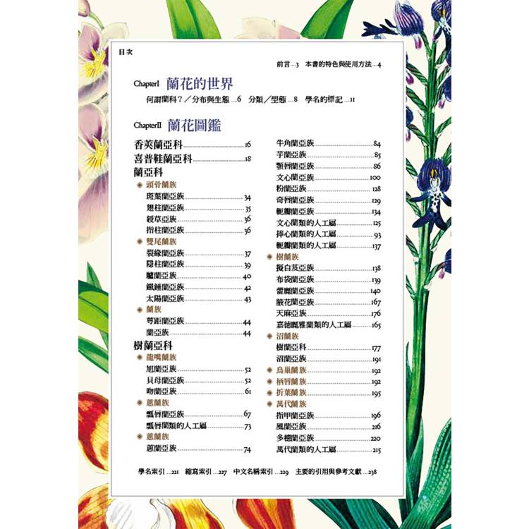 蘭科植物(以下簡稱為蘭花)的魅力當然是其多樣性。一般認為,光是野生的蘭花就多達約26,000種,以被子植物中品種數最多著稱。此外,該科至今仍持續分化並產生新的品種,且隨著深入調查其棲地,每年還會公布約500種新品種。蘭花已經適應並棲息於熱帶雨林乃至沙漠、草原與濕地等各式各樣的環境,因此其生態亦相當多樣。本書也會介紹野生蘭花的野生狀態。此外,蘭花的花卉構造與授粉的昆蟲或鳥類密切相關,僅允許特定的授粉者進行授粉,由此催生出多樣的花卉構造。如果能搭配照片來欣賞其種類、生態與型態的多樣性就再好不過了。此外,因蘭花美麗的外觀,人們自古以來便持續讓其交配,由此孕育出眾多種間雜交種與屬間雜交種。本書羅列了151個屬、19個人工屬、522個野生種及其個體、99個人工雜交種,並介紹最近蔚為話題的基因改造植物,好讓讀者能欣賞蘭花多樣性的魅力。不僅如此,還以蘭花冷知識的形式來介紹與蘭花相關的主題。
